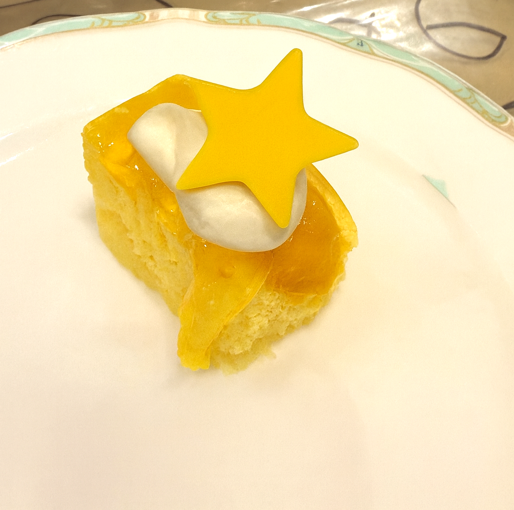 食事を楽しむ時間もあり、私はオレンジジュースを飲みケーキを食べてみることにしました。可愛らしい小さなケーキで、上にはフルーツのゼリーが乗っていて、とてもさっぱりとしていました。その他にも焼きそばやサラダなど、豊富な種類があり、見ているだけでも美味しかったです。